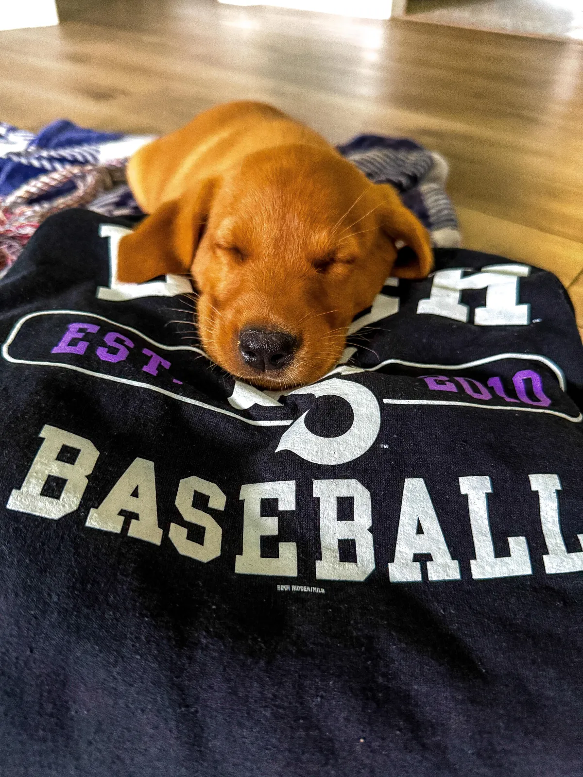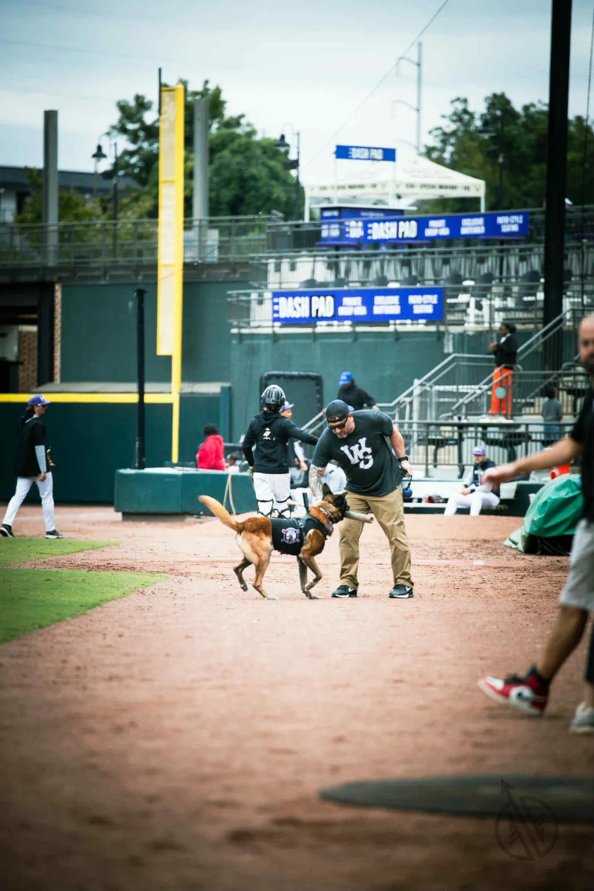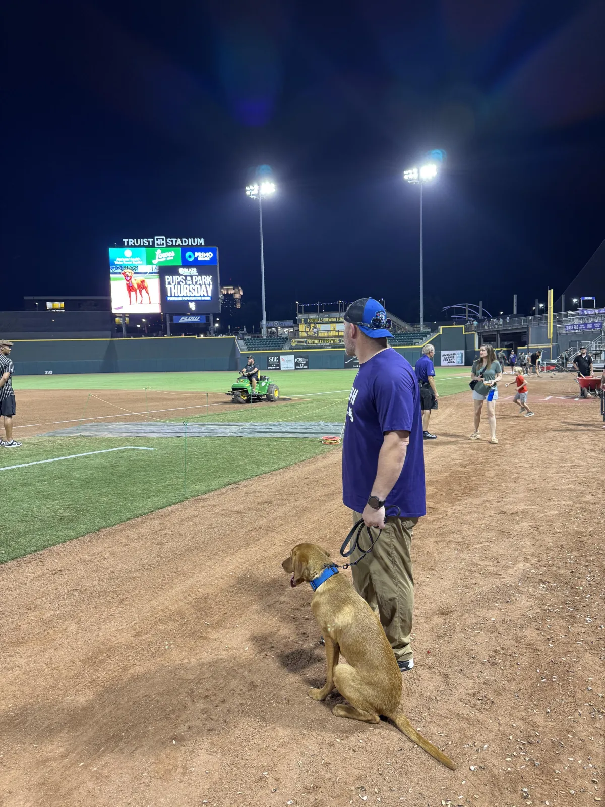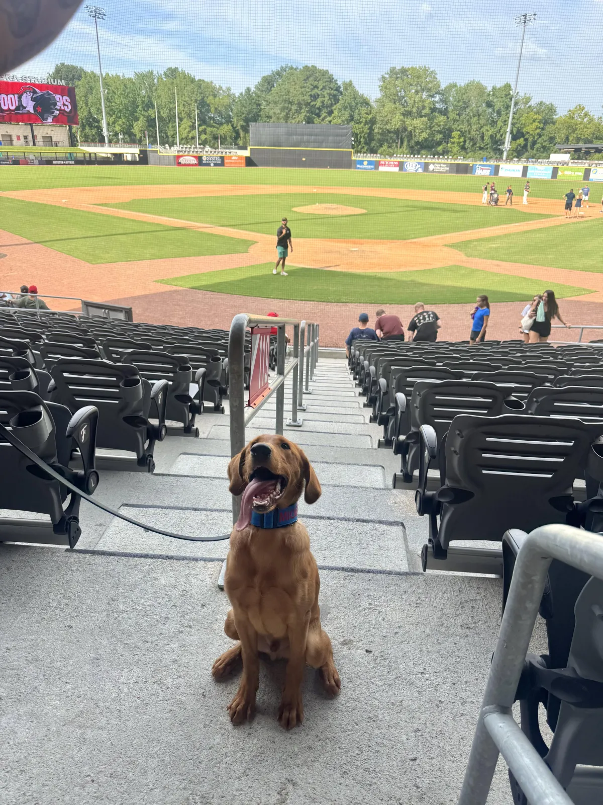 Mickey is the new up and coming bat dog, trying to follow in Murphy’s footsteps. Mickey is a red fox colored Labrador Retriever, with an insane amount of energy and love of retrieving baseball bats already. Mickey was 6 months old when he made his first practice bat retrieves on two different Minor League fields in the same month, at the Winston-Salem Dash & Fayetteville Woodpeckers stadiums.